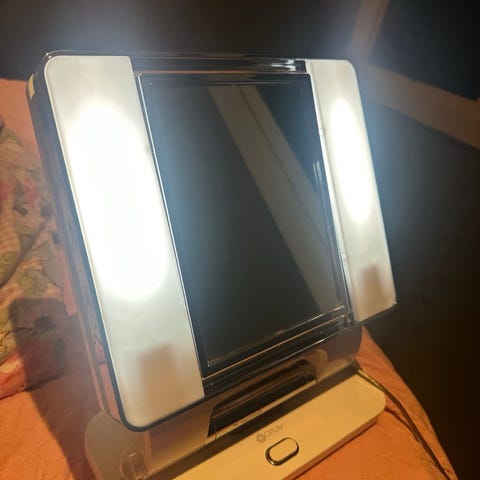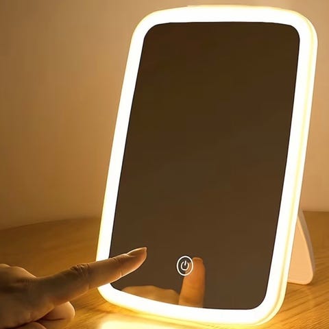 Lettplassert sminkespeil 46 x 36 cm som lyser med et mildt skinn. Drives med 8 x AA/LR6-batterier (selges separat) eller medfølgende nettadapter. Kan henges på veggen eller plasseres stående. Innebygd 8-timers timer ved batteridrift. Dekorativ belysning – sminkespeil med kraftigere lys selges separat. Lite brukt, som nytt.