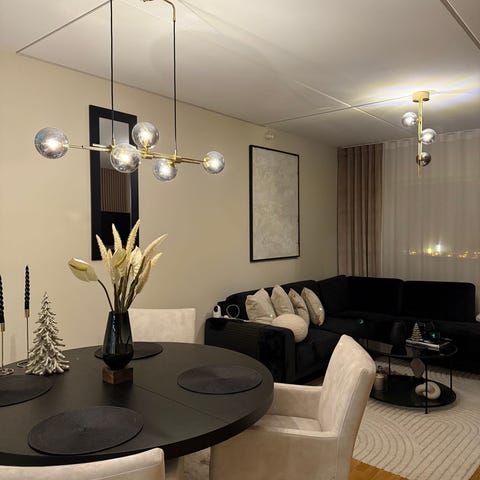 Taklampe av metall i matt, svart finish. Takkopp med 3 metallstaver som er festet i 3 armer. Armene kan justeres sideveis, ikke i høyden. 6 skjermer av glass.