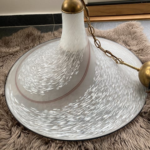 Murano lampeserie Vintage selges billig samlet 6 stk lamper 1 stk stålampe 1stk taklampe 2 stk bord lampetter og 2 stk vegg lampetter ( vegg lampettene har hvit ledning) selges billig ev bud.