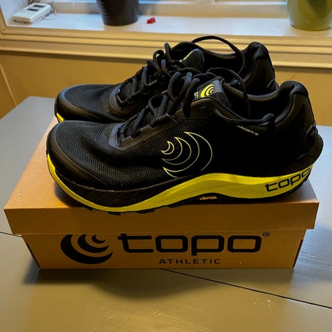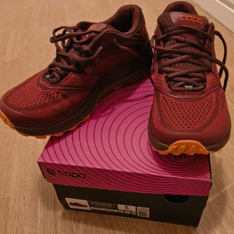 Selger et par pent brukte løpesko for terreng fra Topo Athletic. Merket er kjent for sin romslige tåboks samtidig som de sitter godt på hæl og midtfot. Skoene har Vibram-såle, som gir supert grep, og 5 mm dropp. (Selges da jeg har gått over til null dropp).