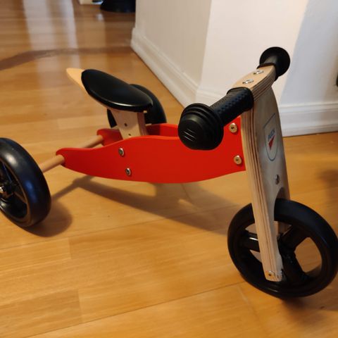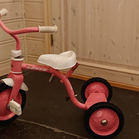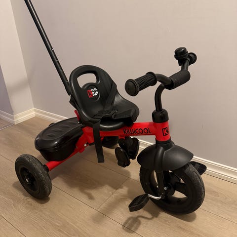 Fin trehjulsykkel til barn selges. Den har belte så barnet sitter stødig på, og kan styres bak.