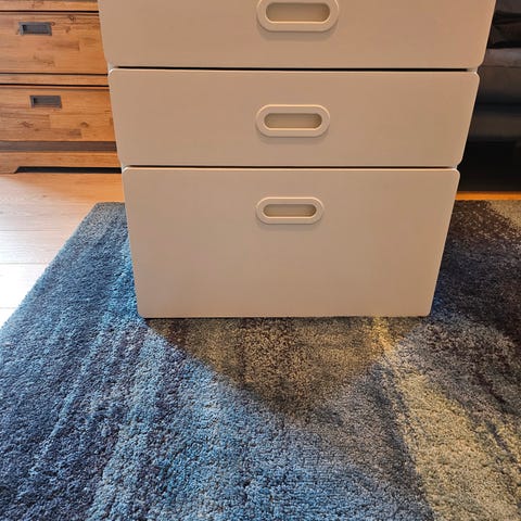 Småstad bokhylle fra IKEA i hvit. Ikke synlig brukt. 3 skuffer. Målene er 60×57×123.
