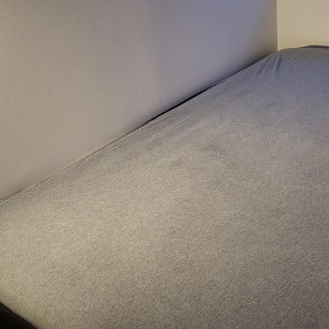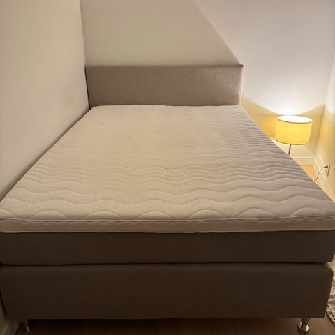 Sengen selges komplett med tilhørende trapp, hyller, kommode, madrass og overmadrass. Overmadrassen er ny.