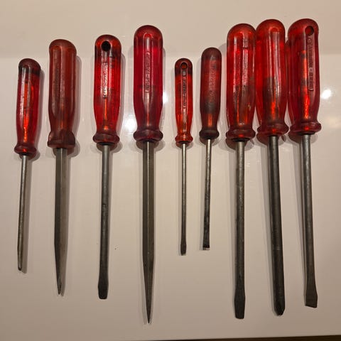 11 gamle skrutrekkere med håndtak og et jern uten håndtak