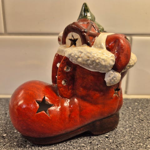 Pakke med et julehånd håndkle, duftlys og to telys i morsom trefasong.