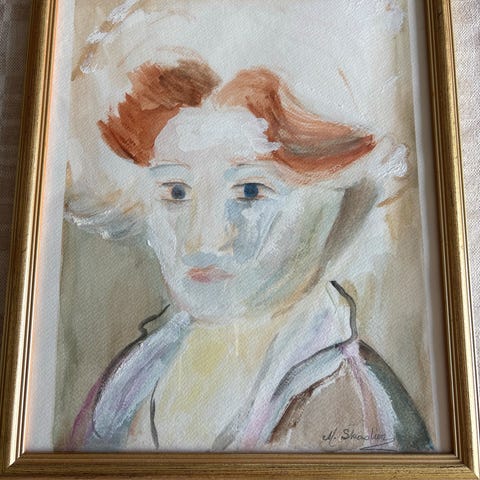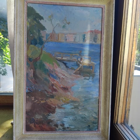 Motiv: Maleriet viser en solfylt kystlinje med oransje og gule farger, vann og et lite naust.