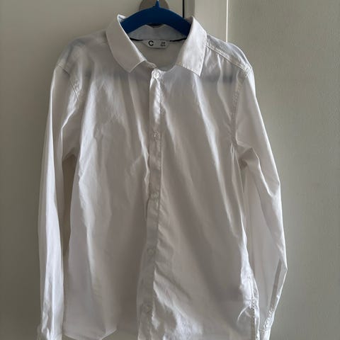 H&M skjorte for barn i størrelse 128. Skjorten er hvit og laget av bomull. Designet for gutter. Ikke brukt.