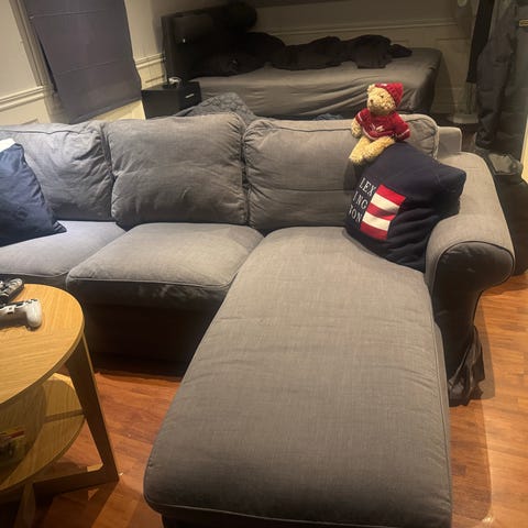 En del av IKEAs Söderhamn modulsofa bruk som lenestol med to armlener. Kjøpt i 2021 har den stått på barnerom og primært brukt for å sitte i og lese og er pent brukt, men har noen flekker og trekker trenger en vask- selges derfor billig.
