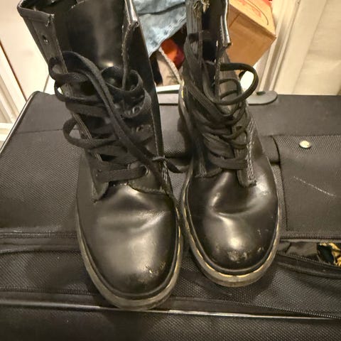 Dr. Martens støvler i størrelse 37. Støvlene er laget av lær, har snøring foran og glidelås på siden for lettere å ta av og på. De har en robust såle som gir godt grep. Passer for personer som ønsker høye støvler med klassisk design. Vinrød farge.