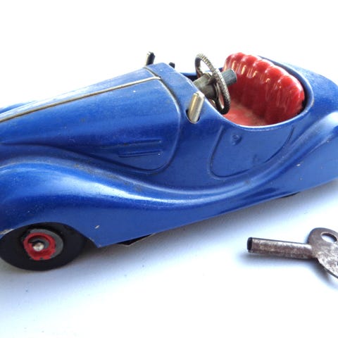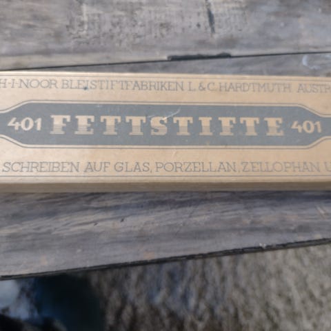 Gammel slitt boks med bruksanvisning. Høyde 9 cm høy og diameter 5 cm.