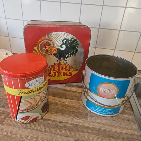 3 metallbokser for Freia bakepulver med bruksanvisning og gode, gamle oppskrifter for Freia formkake 😊