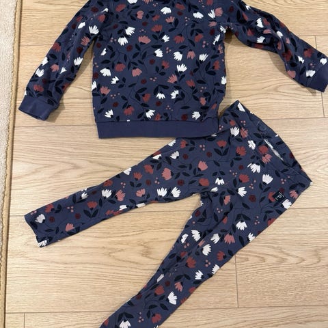 Polarn O. Pyret set i størrelse 104. Langermet genser og matchende leggings i bomull. Buksene har 7/8 lengde. Perfekt for vår/sommer. Pent brukt. Ingen anmerkninger.