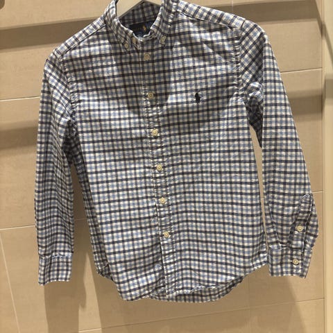 Ralph Lauren Slim Fit skjorte i blå bomull, størrelse 140 for gutt. Skjorten har knappestolpe og brodert logo på brystet. Passer til hverdagsbruk og formelle anledninger.