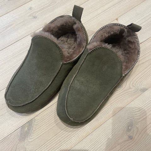 Pent brukt tøfler i semsketskinn med saueskinnspels innvendig.