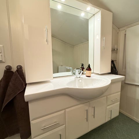 Pent brukt baderomsskap med tilhørende speilskap. Med integrert belysning og vask. Hentes på kampen, kan eventuelt leveres i Oslo etter avtale. En bit av servanten har skallet av når det ble bært ut av leiligheten, se bilde.