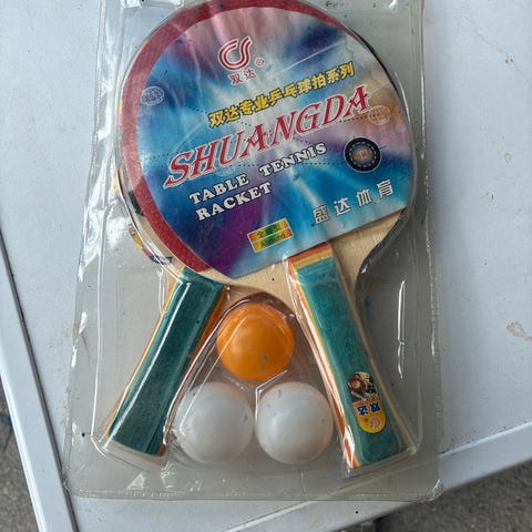 Slazenger bordtennissett med klemmer og to Donic Schildkröt bordtennisracketer, tre baller.