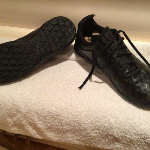 Adidas Predator fotballsko for kunstgress. Fargen er hvit med grønne detaljer. Skoene er i størrelse 34.