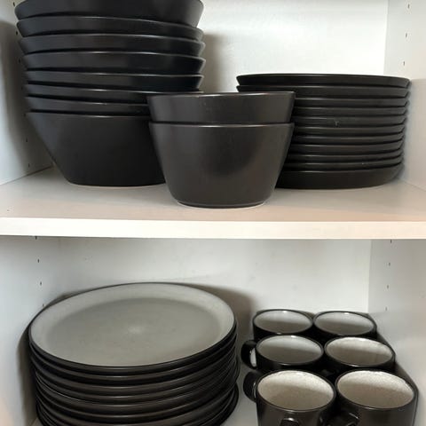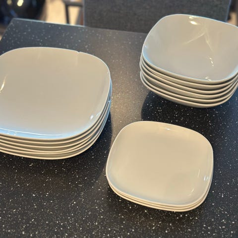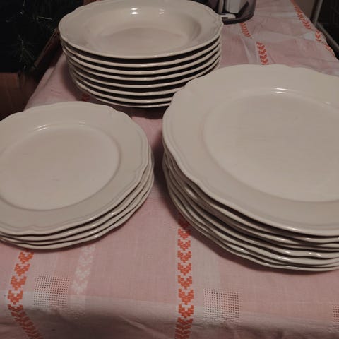 IKEA servise bestående av tallerkener og krus i beige farge. Noen tallerkener har små skader på kanten. Passer til daglig bruk i kjøkken og spisestue.