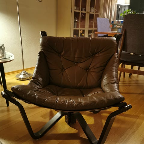Lenestol skinn. Krom. Dansk design. Postmoderne lenestol. Retro lenestol. Art Deco. Vintage lenestol.