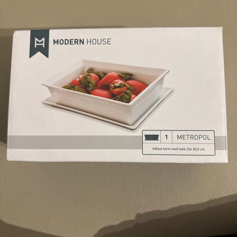 Ildfaste former med lokk fra Modern house selges. Formene er laget av porselen. De har praktiske håndtak og er pene til servering. Den minste måler 15 cm x 15 cm x 5,5 cm. Den mellomste måler 23,5 cm x 23,5 cm x 6 cm. Den største måler 25,5 cm x 25,5 cm x 7,5 cm.