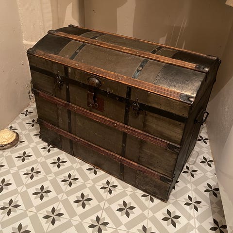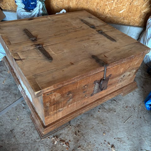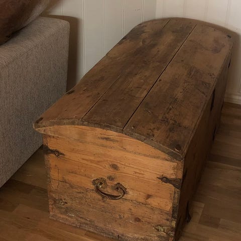 Antikk tre kiste med hengslet lokk og metallbeslag. Kisten har en rektangulær form og er foret med stoff på innsiden. Egnet til oppbevaring av ulike gjenstander.