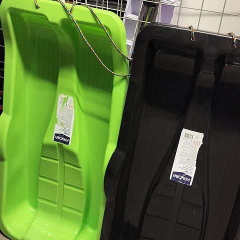 RYDR akebrett med fargerikt grafisk mønster i rosa og blått. Brettet har flere festepunkter for bindinger og en svart underside.