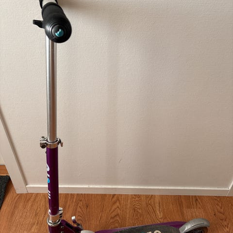 Micro Mini Deluxe sparkesykkel i blå farge med oransje detaljer. Sparkesykkelen har justerbart styre og er designet for barn.