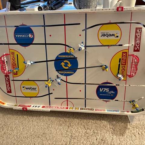 Stiga Play Off 21 bordhockeyspill med spillere i blått og gult. Spillbrettet har detaljerte reklamelogoer og er laget for bordspill. Passer for hockeyentusiaster og bordspillmiljøer.