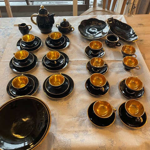 Vakkert håndmalt servise trolig PP ? før stempling. Det er signert/ malt med 146 i bunnen. En del av gullet i kantene er slitt bort, men tallerkene og serviset er svært vakkert. Serviset er mulig fra 1887 da PP startet med produksjonsmerking da?. De startet med 1 og oppover. Serviset er egentlig tidstypisk for 1700-1800 tallet. Hvis noen her vet sikkert hvor det kommer fra tar jeg gjerne mot informasjon.