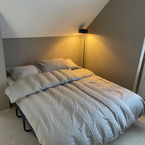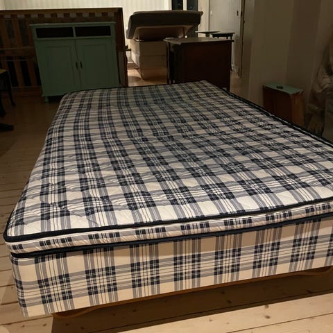 150x200, følger med en tjukk overmadrass og en tynnere.