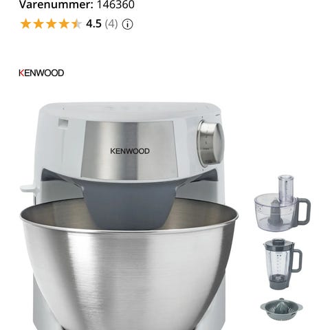 Kenwood kjøkkenmaskin med tilbehør inkludert visper og bolle. Maskinen er hvit og egnet for baking og matlaging. Leveres med flere vispeutstyr for ulike bruksområder.