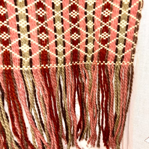 Nåleputen er sydd i afrikansk stoff og fylt med norsk ull. Størrelse ca 10x10 cm. Forside og bakside er forskjellige. Bånd er hentet fra Bulgaria. Fin gave