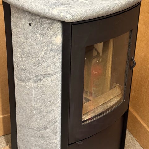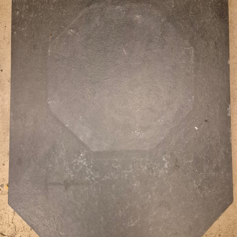 Grå steinplate til peis med buet form. Platen har mål på omtrent 70 cm i bredde og 60 cm i høyde. Se bildene for eksakte mål. Materialet er naturlig stein med synlige årer og variasjoner i fargen.