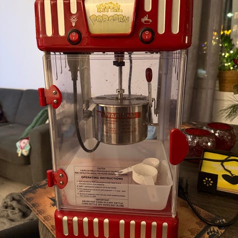 Popcornmaskin fra Clas Ohlson med elektrisk oppvarming, 4,5 liter avtakbar bolle for hjemmelaget popcornproduksjon.