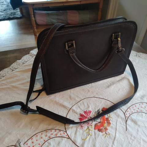Hide lærveske i ekte brunt skinn med kombinasjonslås. Vesken har flere rom for oppbevaring, skulderstropp og et solid håndtak for bæring. Passer til oppbevaring av dokumenter, bærbar og andre nødvendigheter.