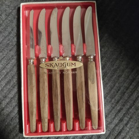 Selger et pent sett med 6 stk. Skaugum fruktkniver (18 cm). Dette er tidløst, norsk kvalitetsbestikk produsert ved Geilo Jernvarefabrikk.