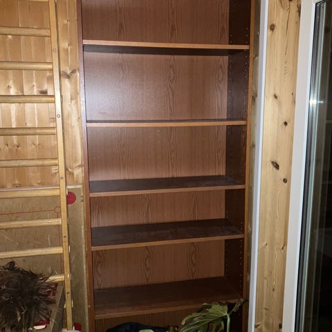 IKEA Billy bokhylle med mål 41 cm bredde, 38 cm dybde og 179 cm høyde. Hylle i svartbrun farge, laget av tremateriale. Passer til oppbevaring av bøker og diverse gjenstander.