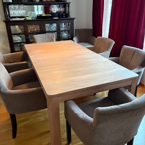 (Reservert ut 25.01)Spisebord eik 100 x 220/310 med (10 gratis skinnstoler)