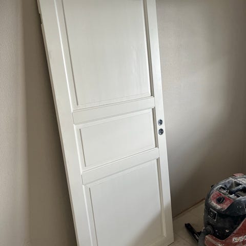 1 stk heltre uten toppskinne, med mål: høyde 204 cm x 92,5 cm. Denne har en skade som vist på bildet. Den er ellers uten skade. Kr 500. Alle er standard hvit.