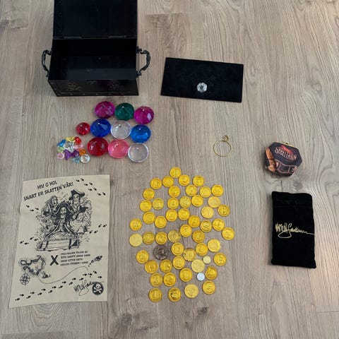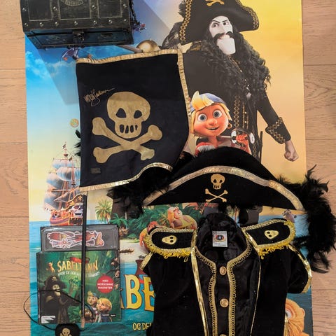 En kasse med pirat leker som kan bygges opp til en strand med palmetre, figurer og møbler. Alt samlet i en pose, mangler deler.
