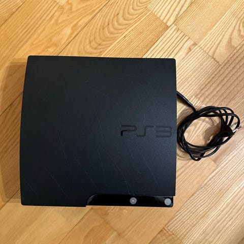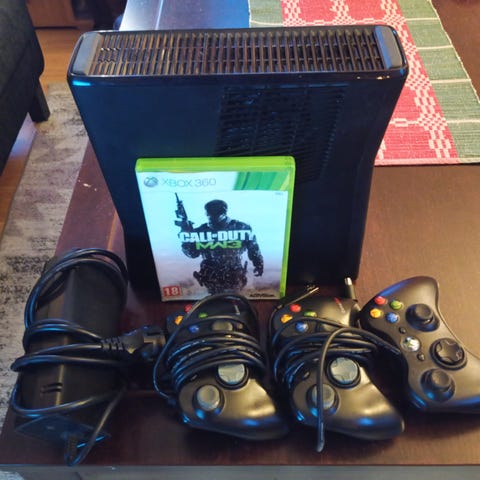 Sony PlayStation 4 spillkonsoll med to svarte kontroller og tilkoblingskabler. Konsollen har et svart kabinett og er designet for hjemmeunderholdning og spill.