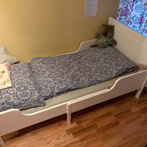Veldig praktisk og pen IKEA uttrekkbar seng i hvit,pent brukt og i god stand. Noe forsiktig når man drar den ut til dobbel størrelse.