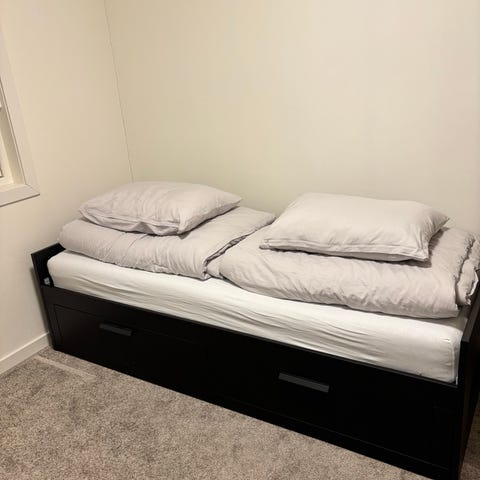 Brimnes dagseng med 2 skuffer, hvit. 2 madrasser 80x200 cm følger med.