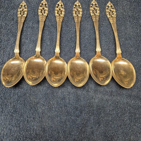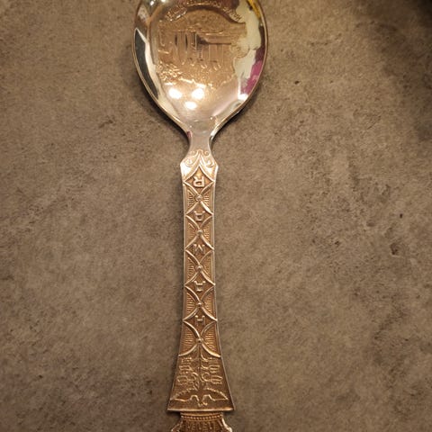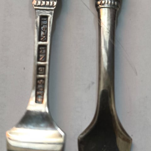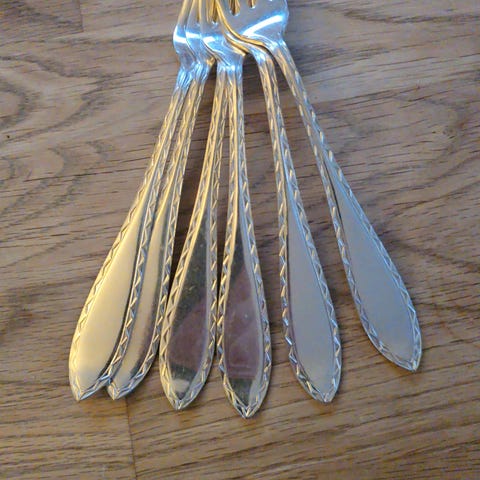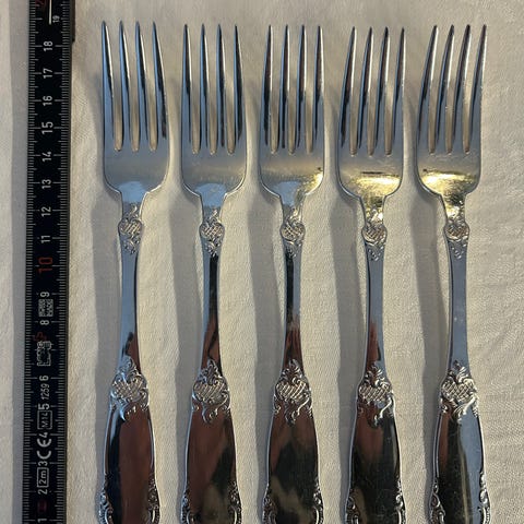 Små: Gaffel er laget av sølvplett merket med "Ex.Pr.N.S.Alp.". Dette er en vanlig forkortelse som står for "Extra Prima New Silver Alpaca".