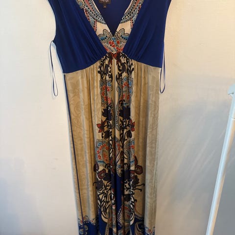 Dette er en virkelig fin kjole fra FAS “Fille à Suivre” Paris. Den har grønne og rosa blomster og gullstriper i stoffet som gir den et litt ekstra preg. Jeg liker spesielt åpen rygg med sløyfe som knytes i nakken, og den går til omtrent knærne på meg (160 cm).