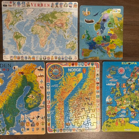 Le Monde Verdenskart barnekart laget i tre med fargerikt design. Kartet viser verdens kontinenter og land med illustrasjoner av dyr og kjente landemerker. Passer for barn som et pedagogisk verktøy for å lære geografi.