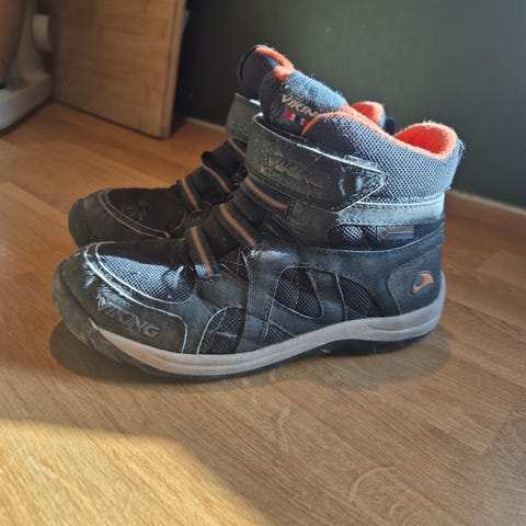 Vintersko fra Viking i størrelse 30. Snøring foran og glidelås i siden. Skoene er synlig brukt med noe slitasje foran på tuppen. Ellers er de i god stand og har masse bruk igjen.
