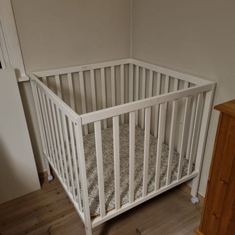 Lekegrind med to nivå og uroarm. Kan brukes fra nyfødt. Skumgummimadrass følger med.
