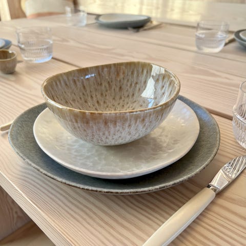 Jysk tallerken i grå/blå keramikk. Brukt i forbindelse med salg av leilighet.