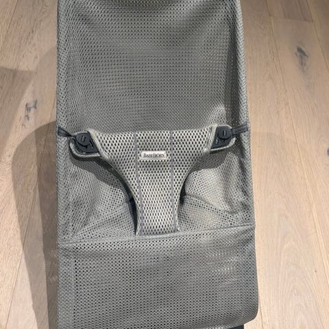 Bouncy chair for babies. White mesh with brown edging. Comes with a bag. Removable mesh can be washed easily in the washing machine.